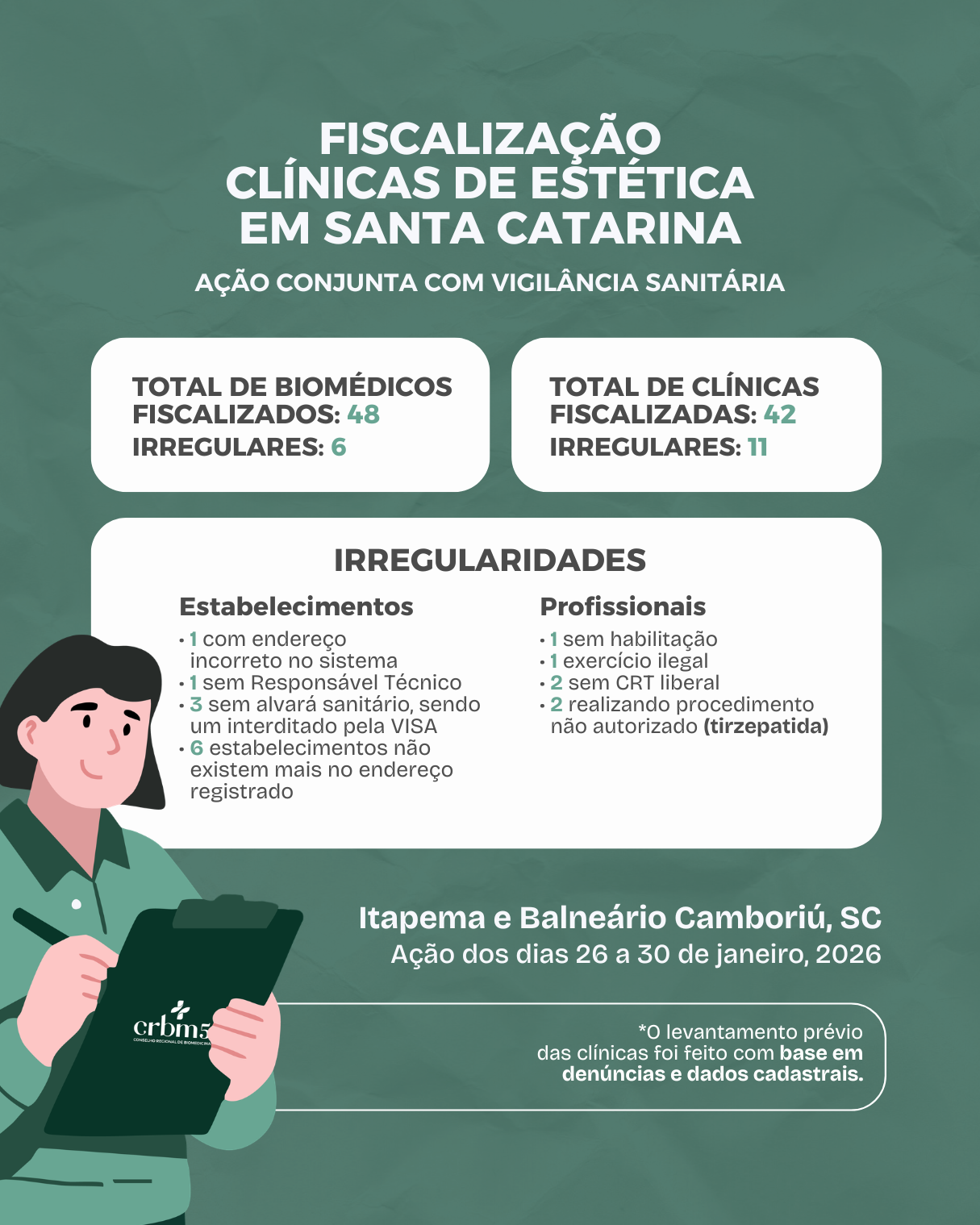 O Conselho Regional de Biomedicina da 5ª Região (CRBM-5) realizou, entre os dias 26 a 30 de janeiro de 2026, uma ação conjunta de fiscalização em clínicas de estética nos municípios de Itapema e Balneário Camboriú, em Santa Catarina. A iniciativa contou com a atuação integrada da equipe de fiscalização do Conselho e da Vigilância Sanitária, fortalecendo o acompanhamento dos serviços oferecidos à população.