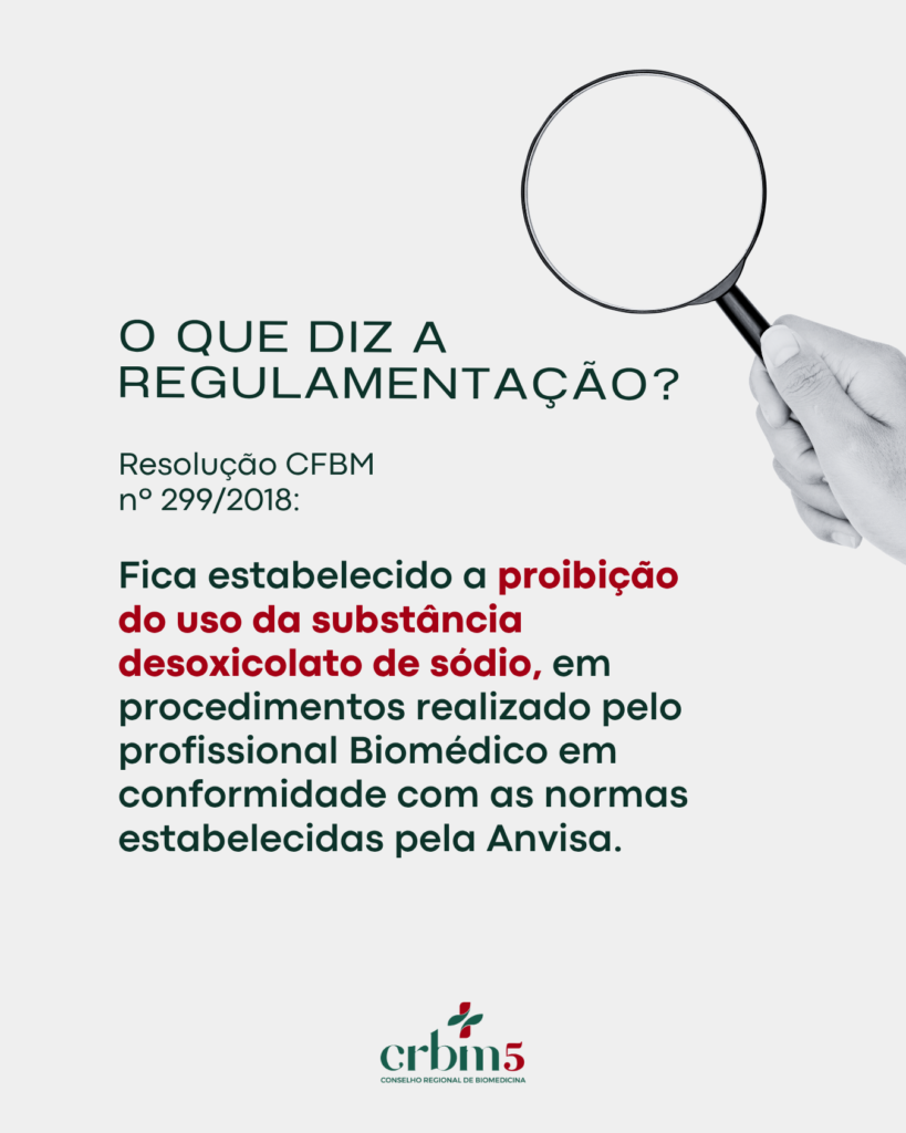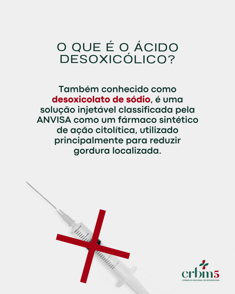 O ácido desoxicólico, também conhecido como desoxicolato de sódio, é uma solução injetável classificada pela Anvisa como um fármaco sintético de ação citolítica, utilizada principalmente para reduzir gordura localizada. Apesar de sua aplicação em procedimentos estéticos, o uso dessa substância pelos profissionais biomédicos é proibido.